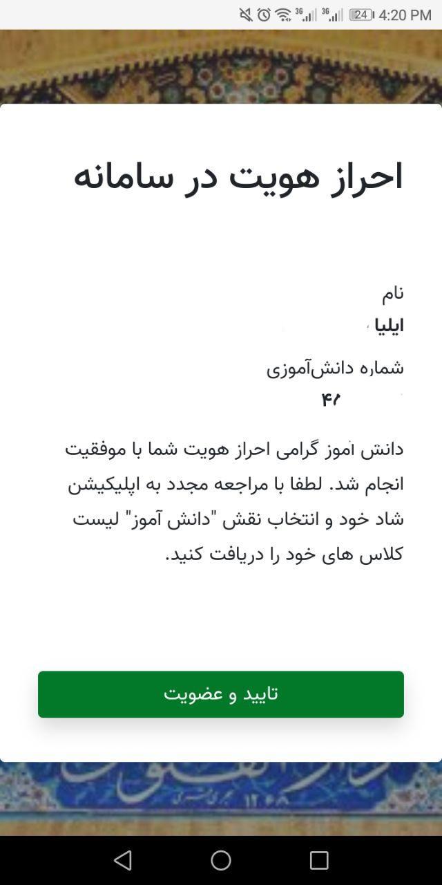 دانشآموزان برای فراهم شدن امکان کار با اپلیکیشن بایستی فرآیند احرازهویت را تکمیل نمایند. این فرآیند صرفا از طریق نصب برنامه قابل انجام است. بدین منظور پس از مشاهده پیام احرازهویت، دکمه آبیرنگ “انجام احرازهویت” را لمس کنید. با اینکار، مرورگر اینترنتی گوشی شما باز شده و مستقیما به صفحه زیر هدایت خواهید شد.