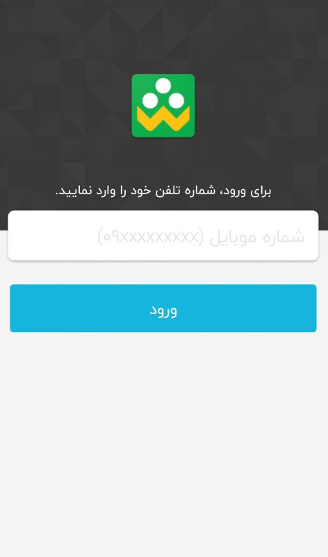 پس از نصب برنامه و اجرای آن با صفحهای مطابق شکل زیر مواجه خواهید شد. در این مرحله شماره تلفنهمراه خود را وارد نموده و منتظر دریافت کد اعتبارسنجی باشید. پس از دریافت کد، آنرا در فیلد مربوطه وارد نمایید: