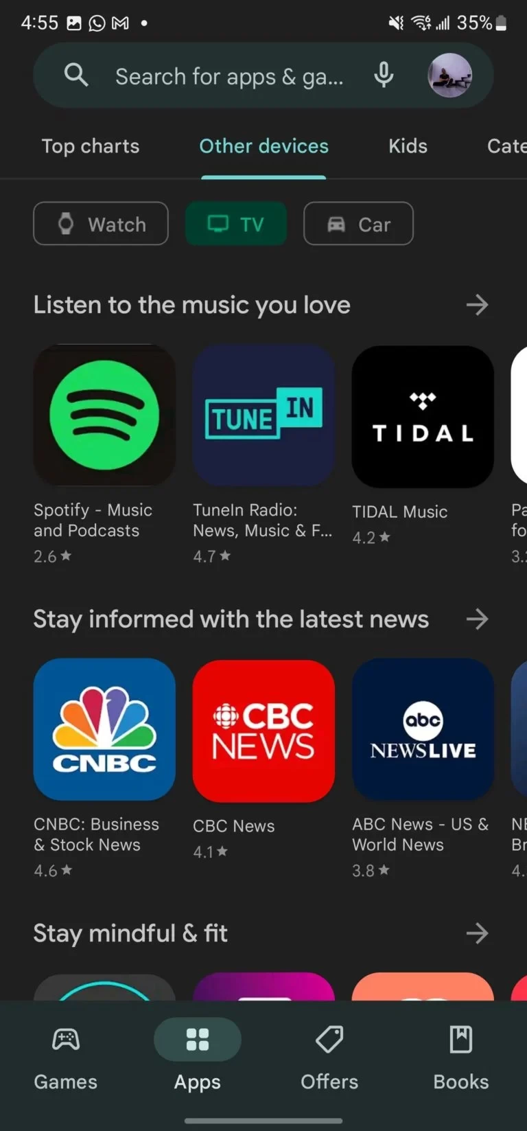با اینحال جستجو برای برنامههای مخصوص ساعت هوشمند یا تلویزیون روی اسمارتفون مستلزم کمی پیمایش درون پلی استور خواهد بود. گوگل از طریق بازطراحی پلی استور امکان انجام آسانتر این کار را فراهم نموده است. اکنون وبسایت 9To5Google به وجود یک زبانه جدید در پلی استور موسوم به “Other Devices” پی برده است. با کلیک روی این زبانه، 3 بخش فرعی ساعت (Watch)، تلویزیون (TV) و خودرو (Car) پیش روی کاربر نمایان میشود.