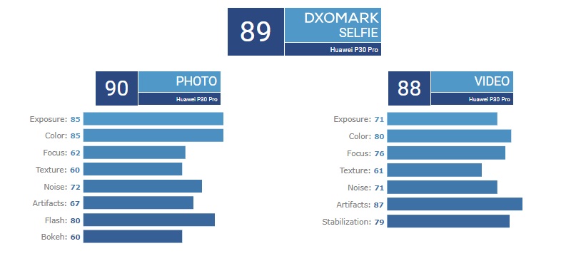 دوربین سلفی 32 مگاپیکسلی هواوی P30 پرو موفق به کسب امتیاز 89 شده که پیشرفت قابل توجهی برای هواوی است اما باز هم در این بخش بهترین نشده و این عنوان در اختیار گلکسی S10 پلاس با نمره 96 است.