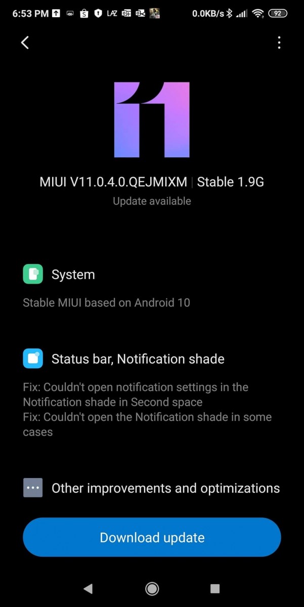 به نظر میرسد که این آپدیت برای کسانی قابل دسترس است که نسخه پایدار MIUI 10 را اجرا میکنند یا اینکه ورژن بتای پایدار MIUI 11 را بر روی گوشی خود دارند. اگر نوتیفیکیشنی را در این رابطه ندیدید، میتوانید بهطور دستی آن را چک کنید. آپدیت جدید حجمی برابر ۱.۹ گیگابایت دارد. این آپدیت همچنین شامل رفع مشکلات جزئی نوتیفیکیشن شید، اسکرولینگ اسکرینشات و Game Turbo هم میشود.