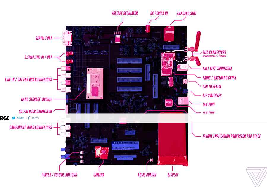 مهندسان اپل از این برد الکترونیکی برای طراحی iOS و آزمایش قابلیتهای ارتباط رادیویی (بیسیم) استفاده میکردند. نمونه اولیه آیفون شامل قطعاتی از شرکتهای مختلف مثل سامسونگ برای تامین ماژول حافظه و همچنین تراشههای مختلف از شرکتهایی مثل اینتل، مارول، CSR ،Infineon و Skyworks است.