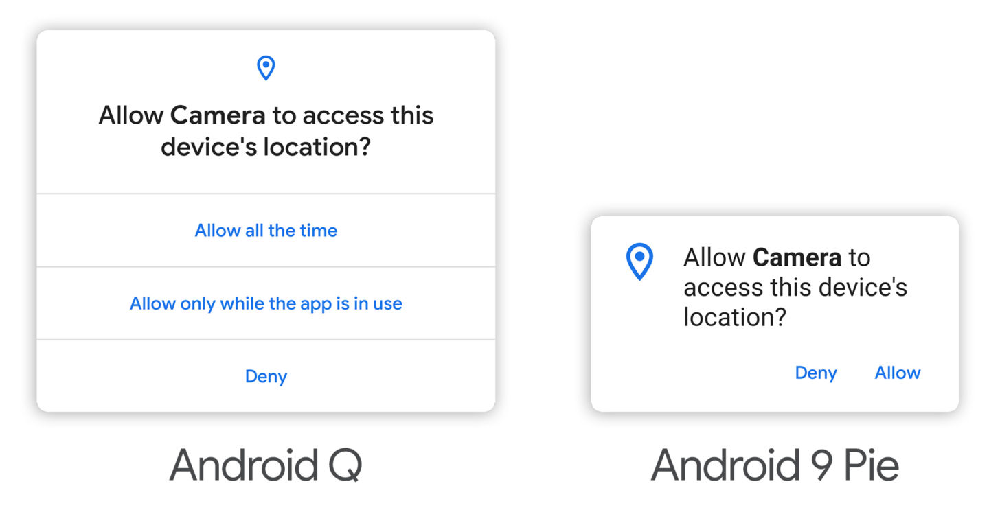 کنترلهای امنیتی با یک گزینه جدید در اندروید Q به شکل پاپ آپ نمایان میشوند. طبق معمول، شما میتوانید یک درخواست دسترسی را مسدود کنید یا نادیده بگیرید، ولی حالا برای برخی موارد این امکان را دارید که فقط زمانی به یک اپ اجازه دسترسی به اطلاعات را بدهید که اپ در پیشزمینه در حال اجرا باشد. این یعنی اپهایی مثل گوگل مپ یا فیسبوک نمیتوانند بدون اطلاع شما موقعیت جغرافیایی شما را در پسزمینه دریافت کنند.