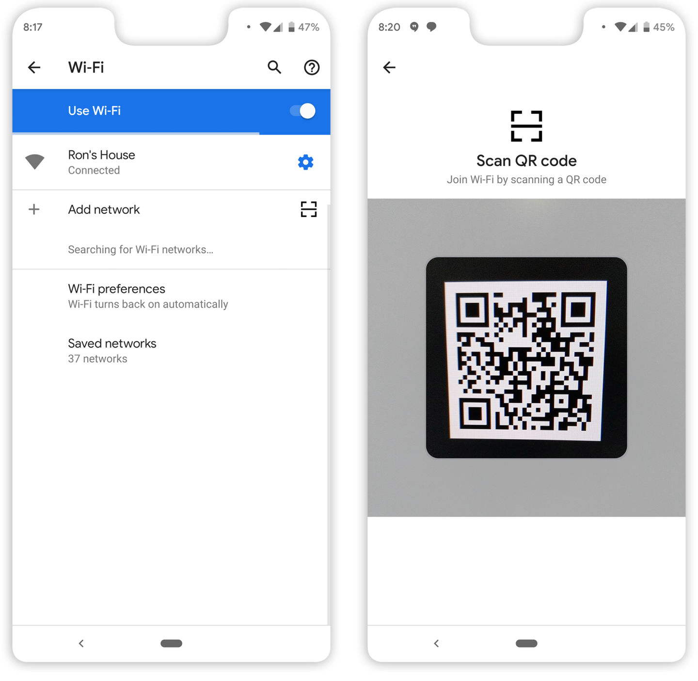 در بخش تنظیمات وای-فای، در کنار دکمه Add Network یک گزینه کد QR هم دیده میشود. اگر بخواهید یکی از شبکههای وای-فای ذخیره شده در دیوایس خود را با دیگران به اشتراک بگذارید، این گزینه در واقع تنظیمات شبکه مورد نظر را در قالب یک کد QR ثبت میشود و شما میتواند آن کد را در اختیار دیگران بگذارید.