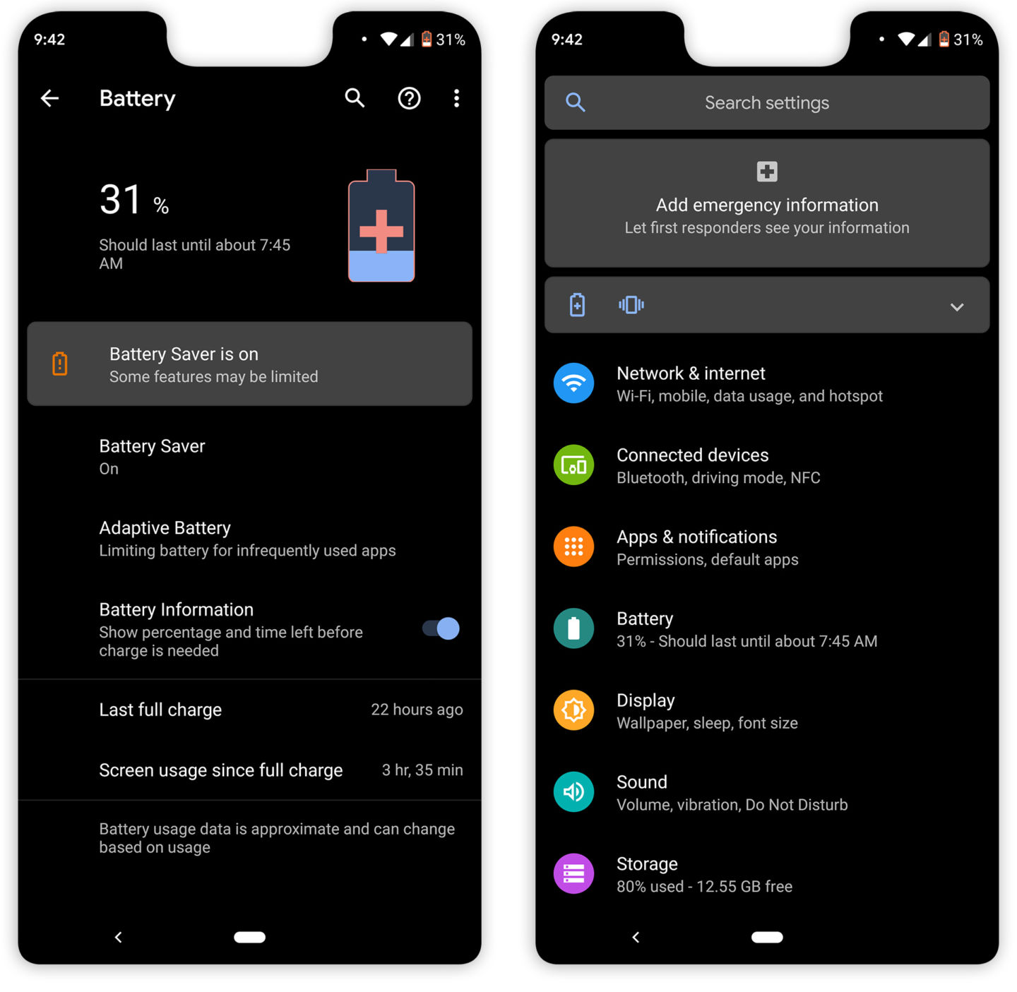 در اندروید ۹ پای، اگر یک تصویر پسزمینه نسبتا تیره برای دیوایس خود انتخاب میکردید، سیستم خودش به طور اتوماتیک تم را به دارک تغییر میداد، ولی گویا این امکان در اندروید Q حداقل فعلا موجود نیست. در عوض تم دارک با روشن کردن حالت ذخیره انرژی باتری به صورت خودکار فعال میگردد. همانطور که ذکر شد، تم دارک بخشهای بیشتر از اندروید Q را در بر میگیرد، به خصوص در بخشها و اپهای اصلی سیستم عامل. ضمنا تم دارک در اندروید Q خیلی تاریکتر از اندروید ۹ است و به جای سیاه متمایل به خاکستری از رنگ کاملا سیاه برای تم دارک استفاده شده است.
