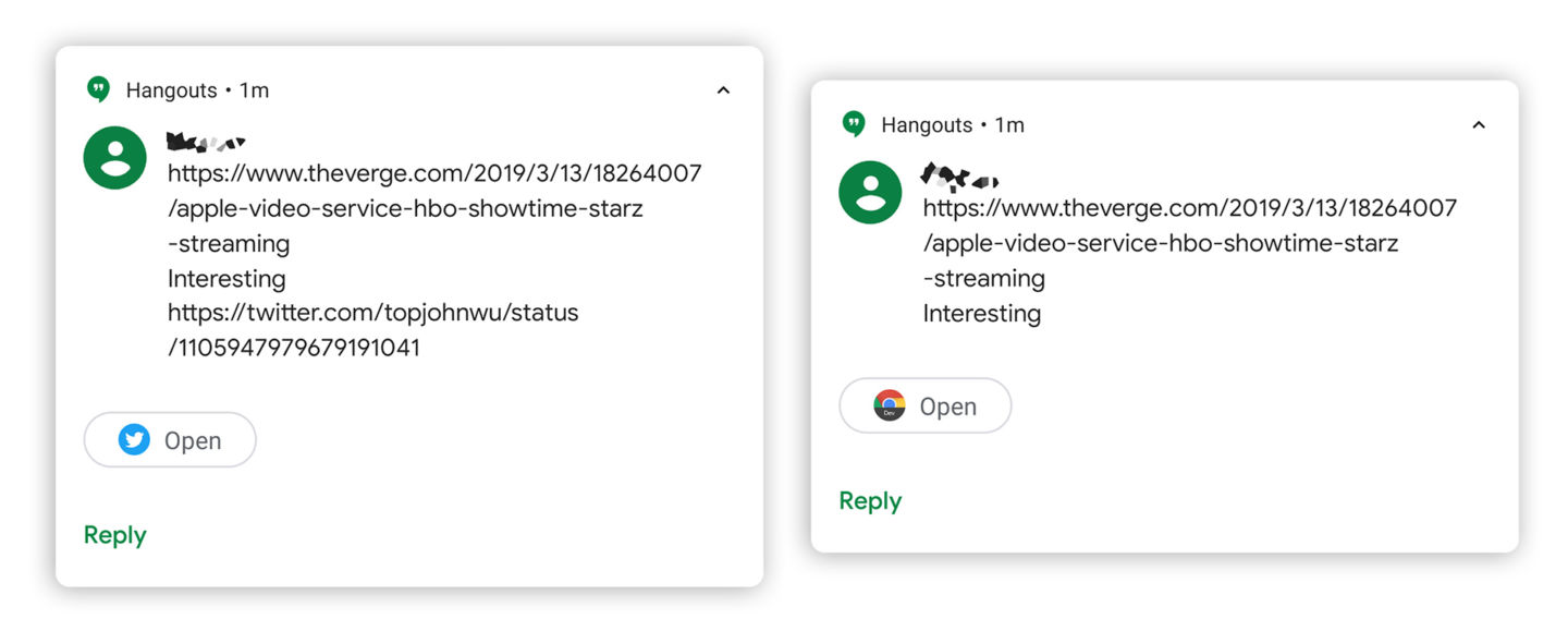اگر شخصی پیامی برای شما ارسال کند که لینکی در آن گنجانده شده باشد، یک دکمه عملگرا هم در کنار نوتیفیکیشن پیام مشاهده میشود (درست در کنار دکمه پاسخ به پیام ) که به وسیله آن میتوانید لینک مربوطه را از طریق همان پنل نوتیفیکیشنها بارگذاری کنید. حال این میتواند باز کردن یک صفحه اینترنتی در مرورگر باشد یا باز کردن یک توییت در اپ توییتر. قابل ذکر است که این ویژگی ثبات چندانی در آزمایشها نداشت و پس از یک ساعت استفاده از اندروید Q دیگر نمایان نگردید که احتمالا این هم مشکلی است که در نسخه نهایی اندروید Q رفع خواهد شد.