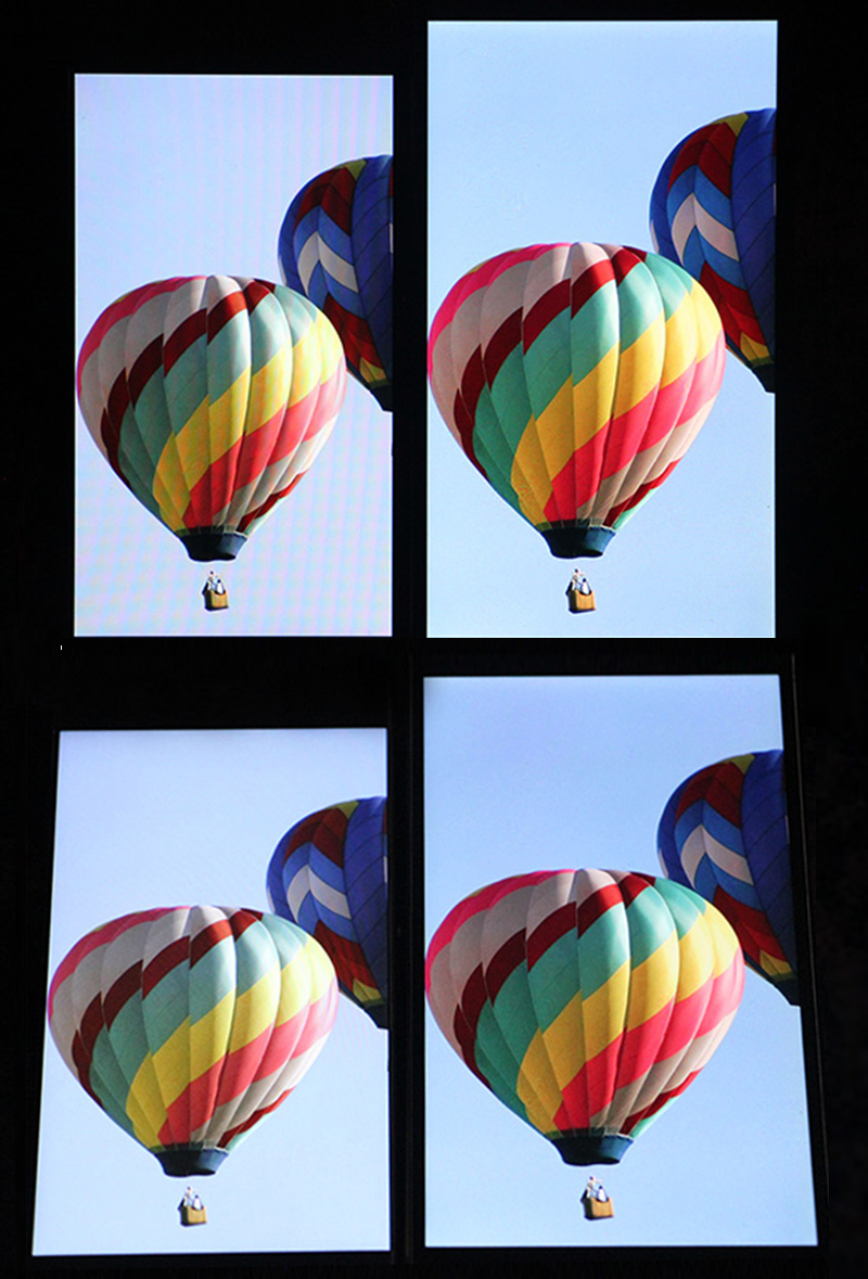 همان طور که مشاهده میکنید در XA، رنگها سردتر و مشکی آن روشنتر است. با تغییر جهت دید سردی رنگها و روشن شدن رنگ مشکی بیشتر خودنمایی میکند. رنگها در الجی G4 واقعیتر نشان داده شدهاند.