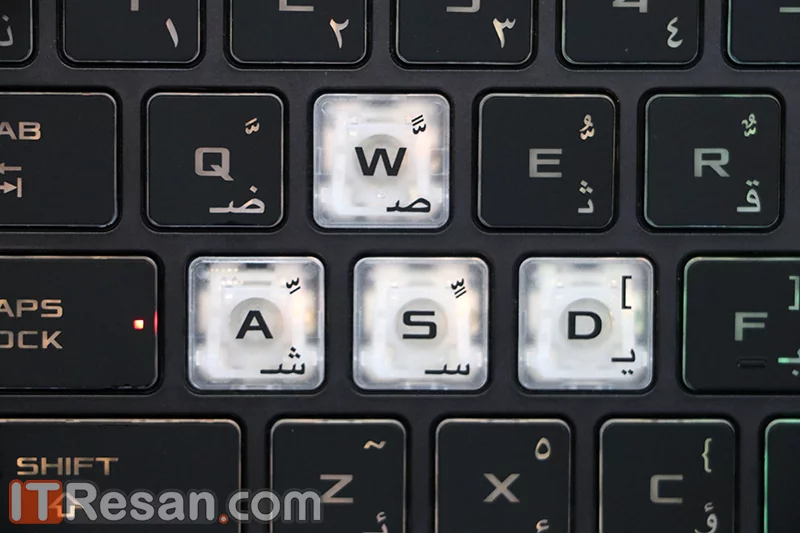 کیبورد نسخهای که ما مورد بررسی قرار دادیم دارای حروف فارسی نبود که جدا از بدیهای آن، ظاهری تمیز و مرتبتر به کیبورد بخشیده است. تنها کلیدهای متفاوت این کیبورد سری دکمههای WASD هستند که دور آنها یک مربع کشیده شده است تا راحتتر بتوانیم آنها را پیدا کنیم.