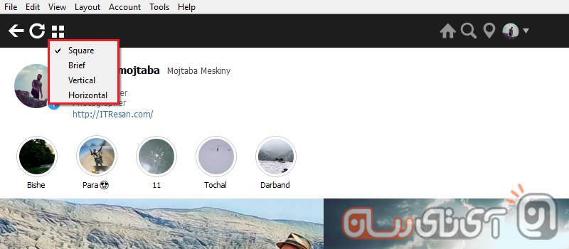 در صفحه نخست برنامه و گوشه بالا سمت چپ، 3 آیکون گنجانده شده که اولی (از چپ به راست) برای بازگشت به عقب، دومی برای رفرش کردن صفحه و سومی جهت تغییر حالت نمایش پستهاست. دو گزینه اول که تکلیفشان مشخص است اما با انتخاب سومی میتوانید نمایش پستها را در 4 حالت مختلف تنظیم کنید. در ادامه این حالتها و عملکردشان را توضیخ میدهیم: