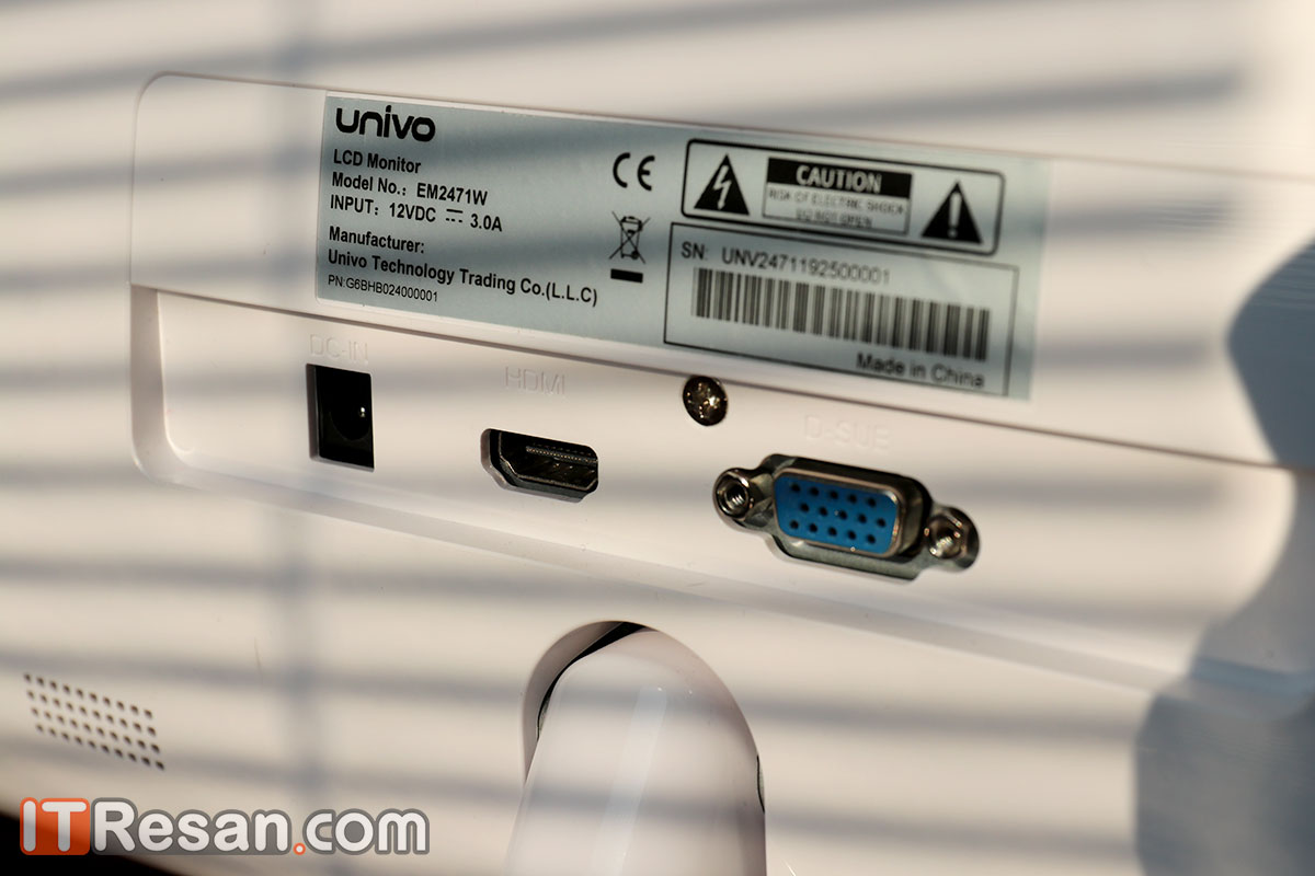 هنگامیکه مانیتور را از پشت مینگریم، همچنان رنگ سفید براق و چشم نوازی نظر شما را جلب میکند اما هنگامیکه به تعداد کانکتورها نگاه کنید، احتمالا حدس میزنید که با یک کالای اقتصادی طرف خواهید بود. وجود تک درگاه HDMI و VGA تنها راههای ارتباطی این نمایشگر را تشکیل میدهند و برق مانیتور نیز از طریق کابلی سفید رنگ تامین میشود. در سمت راست و چپ پایین حفرههایی دیده میشود که بهطور حتم تصور میکنید نقش بلندگوهای یونیوو 24700 را بازی میکنند اما عدم وجود پورت 3.5 میلیمتری این شک را در شما بهوجود میآورد که شاید بیشتر تزئینی بوده و یا منافذی جهت جریان بهتر هوا به پشت مانیتور هستند، شکی که با اتصال مانیتور به کامپیوتر تقویت شده و متوجه میشوید که خبری از بلندگو برای یونیوو نیست.