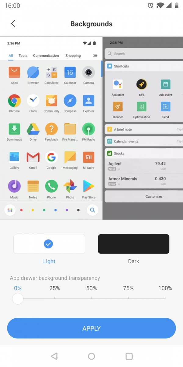 در آخرین آپدیت جدید لانچر پوکو ویژگی حالت تاریک به این لانچر اضافه شده است و شما میتوانید با تنظیم شفافیت نور در پسزمینه نوار کشویی این لانچر، نور پسزمینه را زیاد کرده و یا به حالت تاریک ببرید. این لانچر که توسط شرکت شیائومی برای گوشی هوشمند پوکو F1 طراحی شده، یکی از بهینهترین و زیباترین لانچرهای موجود در پلیاستور است. به دلیل اینکه این گوشی مجهز به صفحهنمایش OLED نیست، این لانچر در حالت تاریک کمترین مصرف باتری را به همراه دارد و با خیال راحت میتوانید نهایت استفاده را از حالت تاریک این لانچر ببرید.
