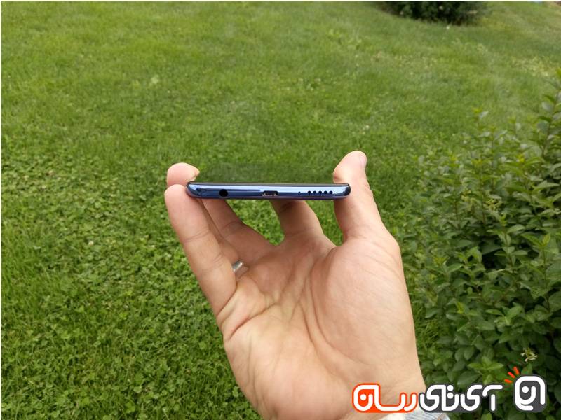 در بخش بالایی دستگاه هیچ درگاه، شیار یا نشانه خارجیای وجود ندارد و تمامی امکانات در بخش پایینی بدنه تمرکز پیدا کردهاند. در لبه پایینی دستگاه به ترتیب از سمت چپ به راست شاهد حضور درگاه ورودی جک ۳.۵ میلیمتری هدفون، درگاه میکرو یواسبی در مرکز و خروجی صدای دستگاه در سمت راست هستیم.