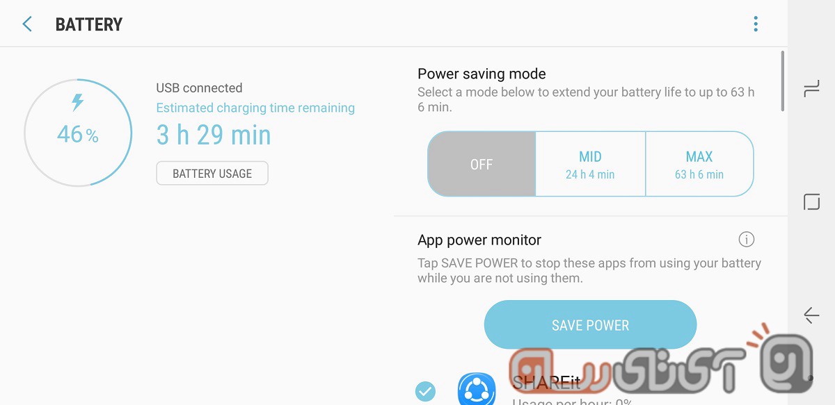 در بخش تنظیمات باتری، نوت 8 اطلاعات جامع و کاملی را در اختیار شما میگذارد. از تایم باقی مانده تا به انتها رسیدن شارژ گرفته تا روند تخلیه باتری توسط اپلیکیشنهای مختلف؛ همه چیز خیلی خوب و ساده به نمایش گذاشته شده است. شما همچنین میتوانید با استفاده از قابلیت Power Saving Mode شارژدهی گوشی را افزایش دهید هرچند که برخی قابلیتهای آن غیر فعال شوند.