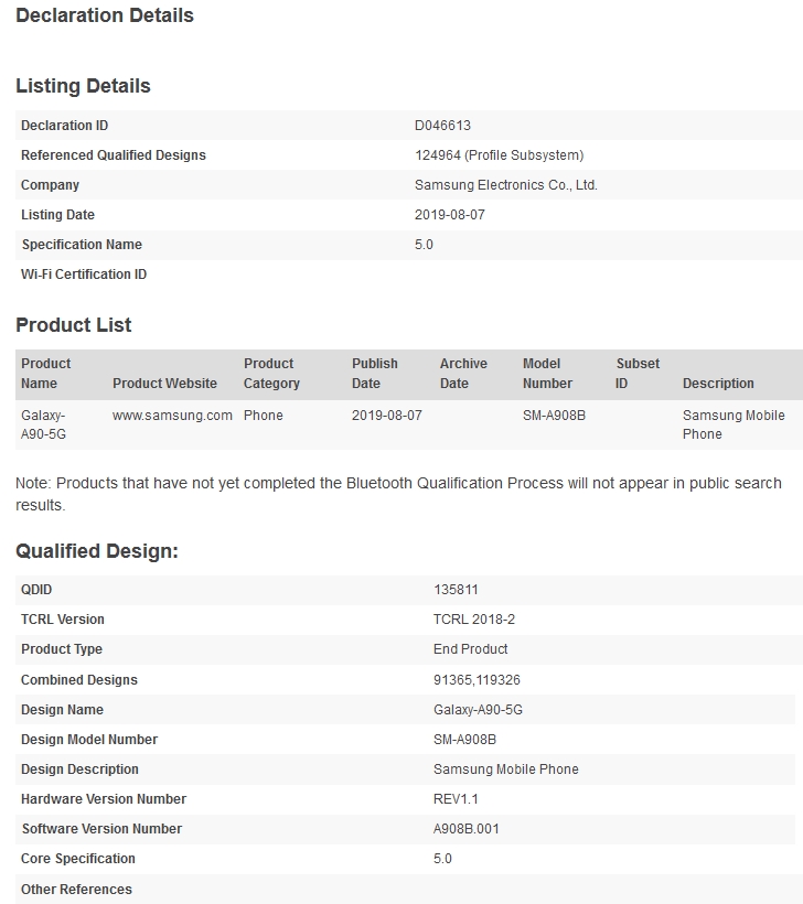 نکته جالب درباره این تلفن که در سایت گروه ویژه بلوتوث مشاهده شده، دو مدل متفاوت آن است. این گوشی با شماره مدلهای SM-A908B و SM-A908N در وبسایت بلوتوث رویت شده است. حتی یکی از شماره مدلها با شماره مدلی که در سایت اتحادیه وایفای وجود دارد، مطابقت دارد و ما احتمال میدهیم که این هندست در دو نسخه 4G و 5G روانه بازار شود. به غیر از اینکه تلفن مذکور از بلوتوث نسخه 5 بهره میبرد، هیچ اطلاعات اضافهای از آن در سایت بلوتوث وجود ندارد.