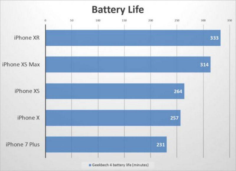 این موضوع بیانگر این موضوع است که رزولوشن پایینتر نمایشگر این مدل در قیاس با دو آیفون دیگر موجب میشود که فشار کمتری به پردازنده گرافیکی وارد شده و به این ترتیب محتواها با نرخ فریم بالاتر و به صورت روانتر به نمایش درآیند. در دو تصویر زیر نتیجه آزمایش آیفون Xr در بنچمارکهای آنتوتو و تست باتری گیکبنچ را نیز مشاهده میکنید که به لطف نمایشگری با رزولوشن 1792 در 828 پیکسل، باتری این دیوایس تا 19 دقیقه بیشتر از آیفون Xs مکس و تا 69 دقیقه بیشتر از آیفون Xs شارژدهی دارد.