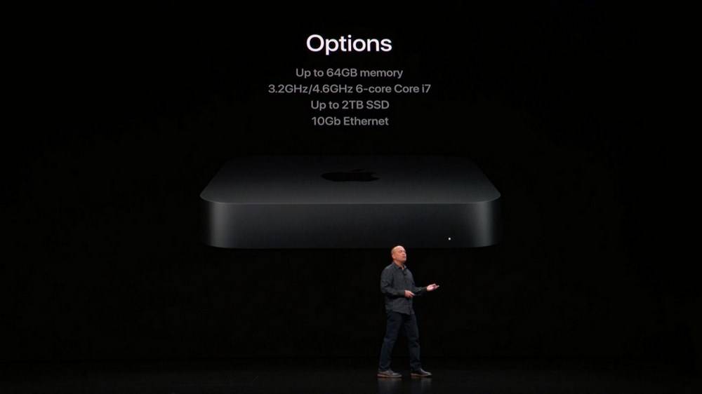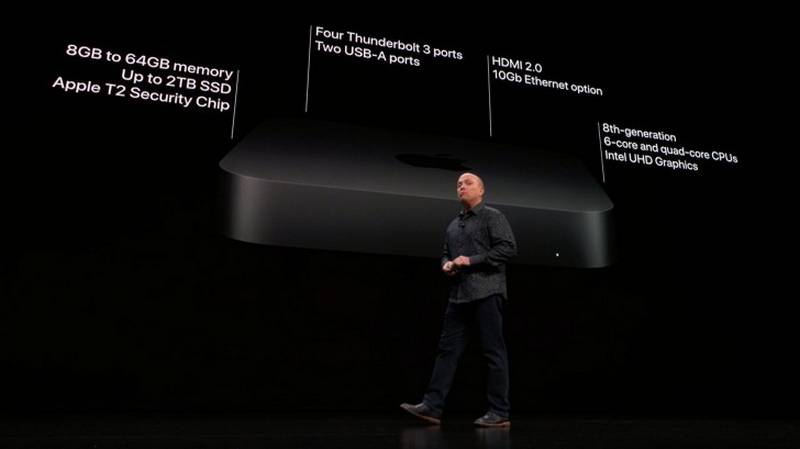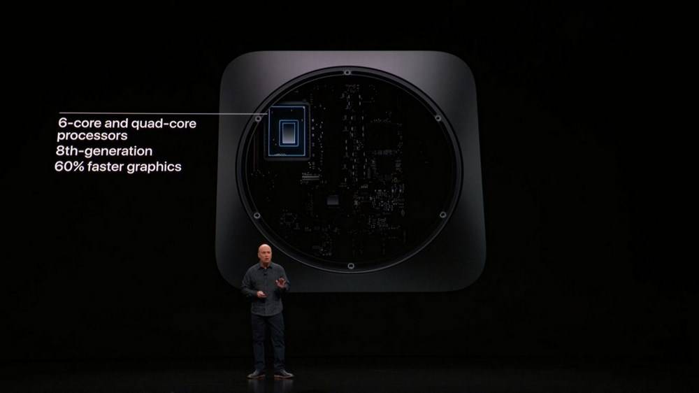 اگرچه مجری برنامه هیچ اشارهای به مدل دقیق این پردازندهها نداشت، اما این اطمینان داده شده که پردازندههای به کار رفته در این دستگاه از نوع پردازندههای موبایلی نیستند. عملکرد گرافیکی نیز با افزایشی چشمگیر همراه بوده و حالا مک مینی جدید در کارهای متمرکز گرافیکی تا 60 درصد قویتر از نسل قبلیاش خواهد بود. جدای از بخش پردازشی، اپل برای این گجت از 8 تا 64 گیگابایت رم الحاقی (از نوع SO-DIMM) با فرکانس 2,666 مگاهرتز در نظر گرفته است. برای حافظه نیز نسخههایی از 128 گیگابایت گرفته تا 2 ترابایت پیش روی کاربر قرار دارد که همگی از نوع SSD هستند. مجموع این سختافزارها موجب شده که مک مینی جدید تا 5 برابر سریعتر از نسل قبلی خود باشد.