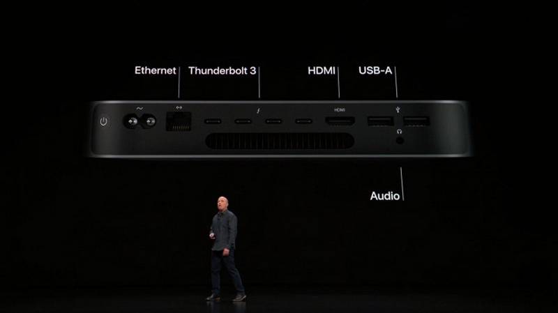 در کمال تعجب و برخلاف رویکردی که اپل در قبال لپتاپهایش دارد، توجه ویژهای به اتصالات مک مینی شده است؛ جایی که در پشت این دستگاه یک پورت اترنت با حداکثر سرعت 10 گیگابیت بر ثانیه، یک پورت فول سایز HDMI 2.0، دو عدد پورت USB-A و چهار درگاه تاندربولت 3 دیده میشود. همچنین درگاه پرطرفدار 3.5 میلیمتری صدا نیز در این بخش حضور دارد. از دیگر موارد قابل ذکر درباره مک مینی جدید میتوان به حضور چیپ امنیتی اختصاصی اپل با نام T2 اشاره کرد که حتی قابل جفتسازی (pair) با مکبوک است. بنابراین مک مینی جدید میتواند برخی از رندرینگهایی (تحلیل و تفسیر) که توسط این دستگاهها انجام میشود را اصطلاحا آفلود (به معنای خالی کردن) کند.